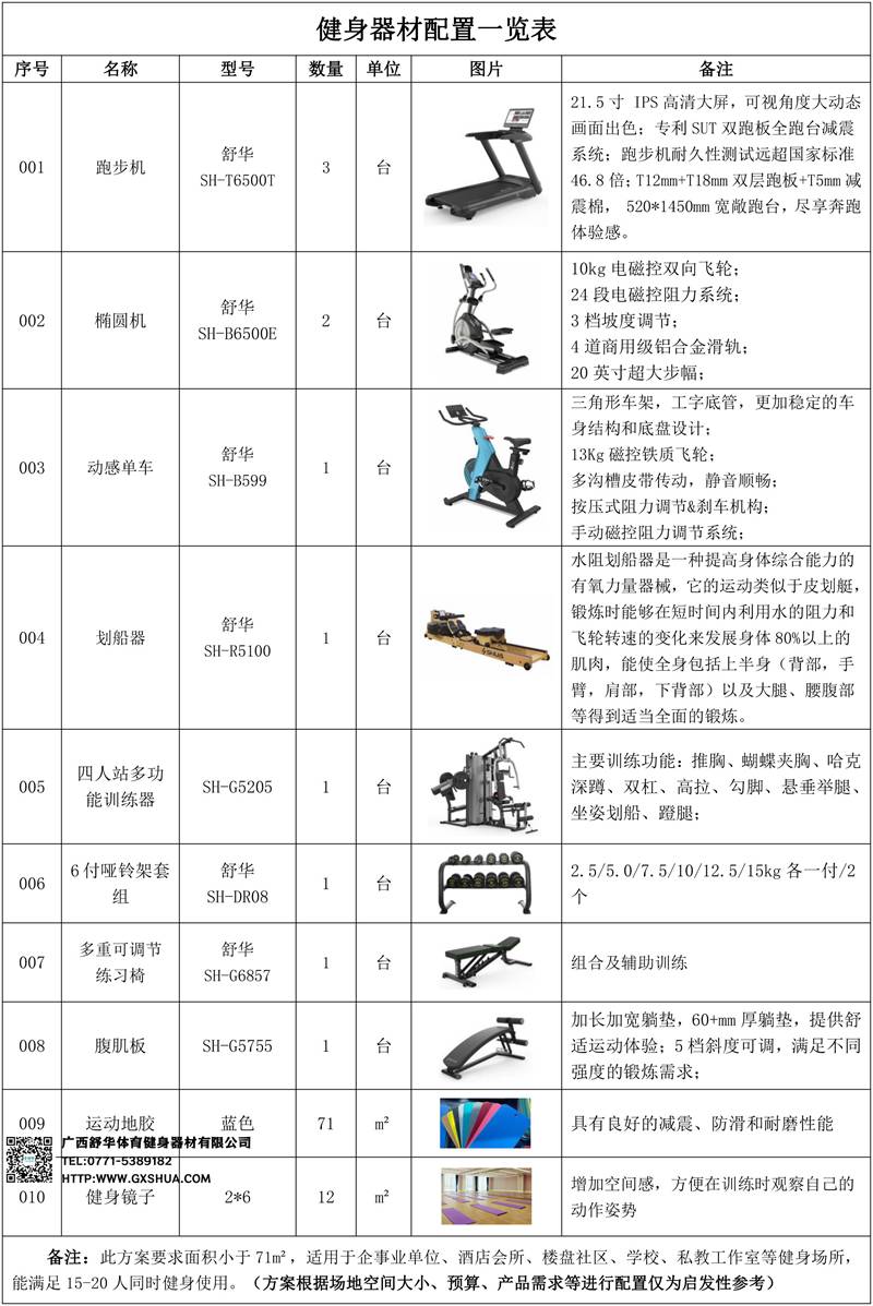 此方案要求面积小于71m²,适用于企事业单位、酒店会所、楼盘社区、学校、私教工作室等健身场所,能满足15-20人同时健身使用。(方案根据场地空间大小、预算、产品需求等进行配置仅为启发性参考)